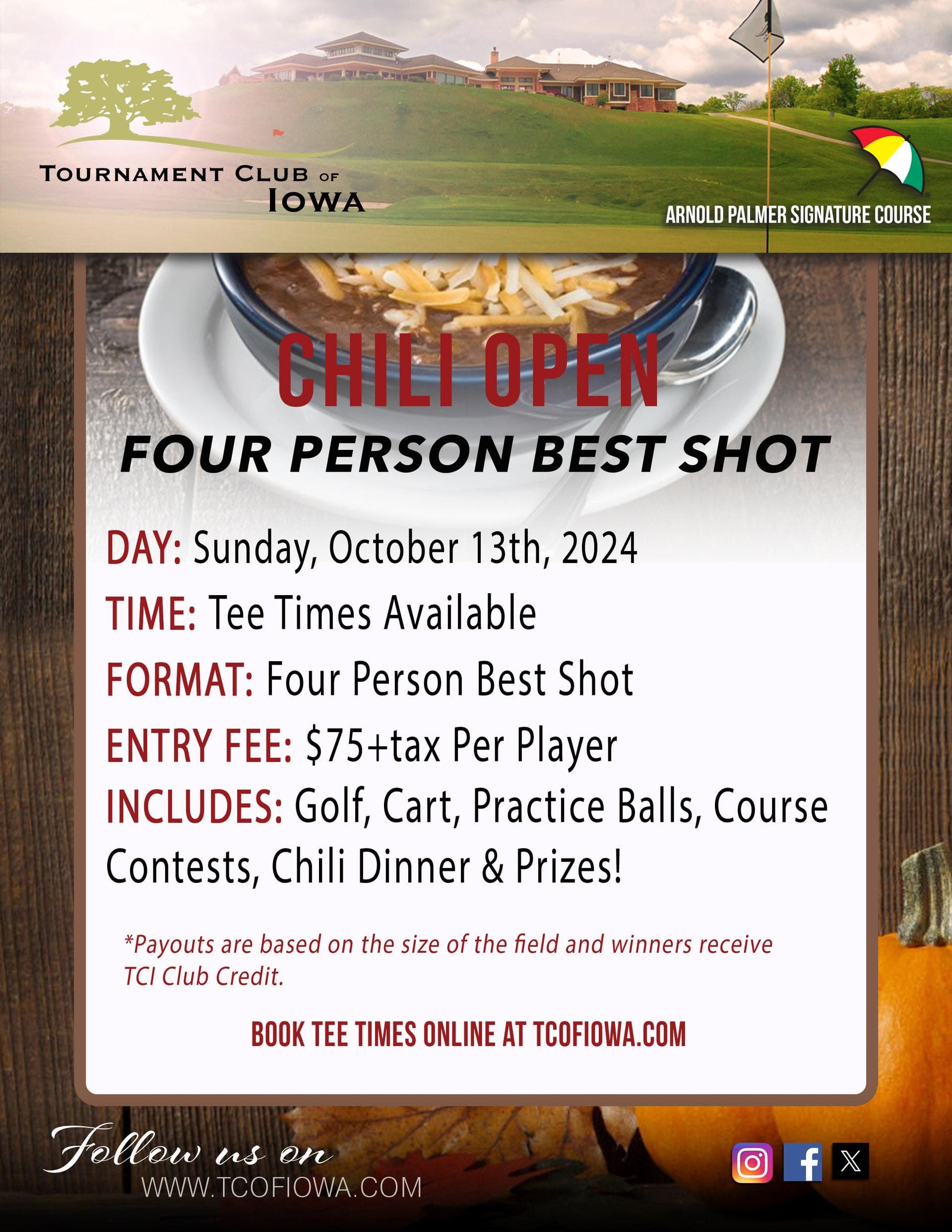 Includes: Golf, Cart, Practice Balls, Course Contests, Chili Dinner & Prizes!